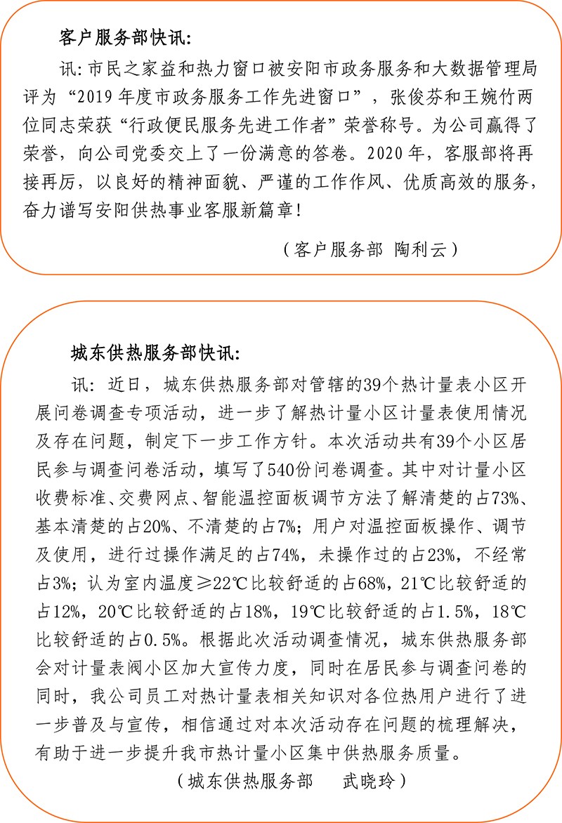 楊總在工作報告中指出,上一年通過公司全體干部職工的克難攻堅、上下合力、團結(jié)協(xié)作,全年各項經(jīng)濟效益指標均達到預(yù)期目標。2020年,我們要以習(xí)近平新時代中國特色社會主義思想為指導(dǎo),全面貫徹黨的十九大和十九屆二中、三中、四中全會精神,增強“四個意識”、堅定“四個自信”、做到“兩個維護”,強力落實各級關(guān)于深化國有企業(yè)改革的政策要求,堅決執(zhí)行市委市政府和市住建局黨組的決策部署,秉承“把以人民為中心作為一切工作的出發(fā)點、落腳點和方法論”的企業(yè)宗旨,堅持“科技引領(lǐng)、規(guī)范管理、優(yōu)良管網(wǎng)、一流服務(wù)”的發(fā)展理念,嚴格“目標明確、時限明確、責(zé)任明確、結(jié)果明確”的工作要求,堅定地擔(dān)負起集中供熱建設(shè)發(fā)展的重大使命,擔(dān)負起實現(xiàn)國有資產(chǎn)保值增值的重大責(zé)任,堅定地推進創(chuàng)新變革、效率變革和質(zhì)量變革,做強做大做優(yōu)國有資本,務(wù)實創(chuàng)新、同心同德,為全市實現(xiàn)“一個重返、六個重大”貢獻益和力量。
